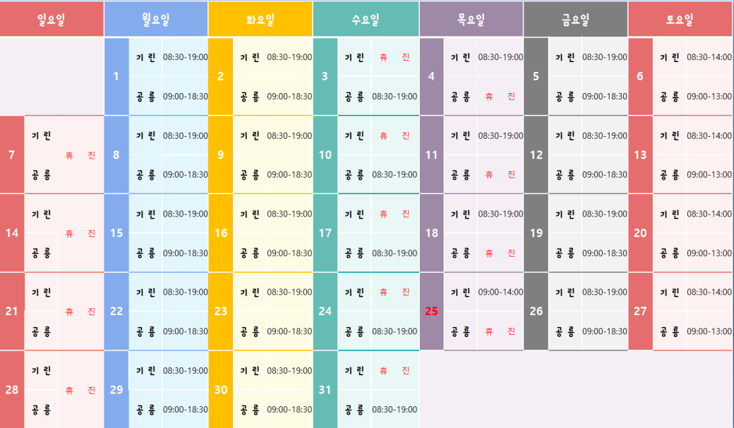 ▷ 토요일 : 08:30~14:00(점심시간 없음)
